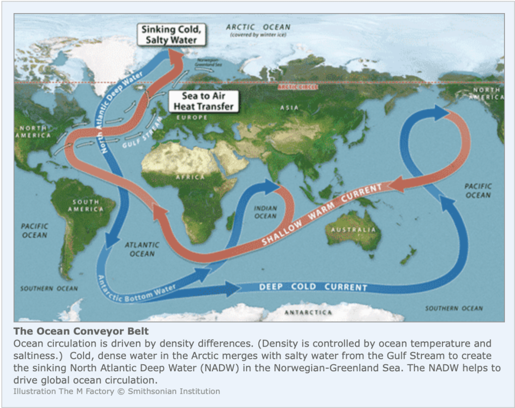 Sea water along the equatorial area gets heated by the sun, and the warmed water forms a stratification layer above the colder lower water. Eastern Trade Winds caused by Earth’s rotation and atmospheric temperatures push this water layer, creating the Global Ocean Conveyor Belt (GOCB).