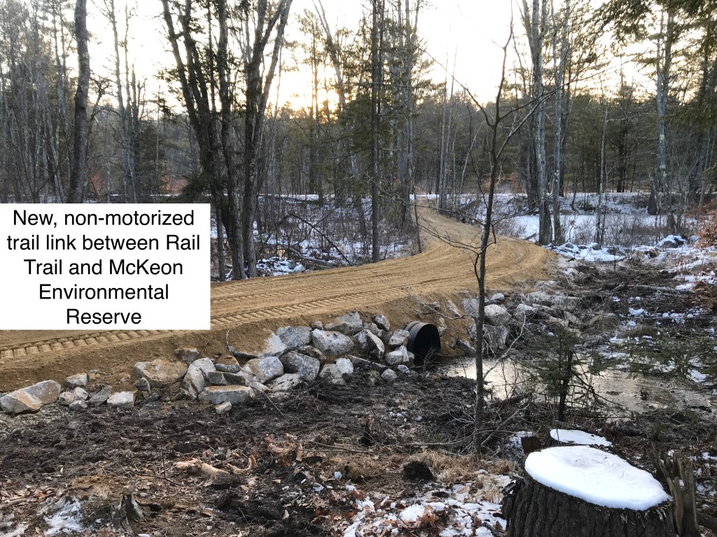 A trails connection between Blanchard Road in Springvale and Sanford City’s Rail Trail was recently competed. This long-awaited, joint effort between Sanford Trails Committee and Sanford-Springvale Mousam Way Land Trust connects non-motorized trail users to the 2 ½ miles of trails on the McKeon Reserve from the 5 ½ mile Rail Trail. This project also results in a joint agreement between the City and the Trust that permits city maintenance vehicles access to the ½ mile of Rail Trail previously inaccessible due to the narrow footbridge over Branch River. More importantly, Fire, Emergency, and EMT vehicles will be enabled, and response times will be greatly improved.