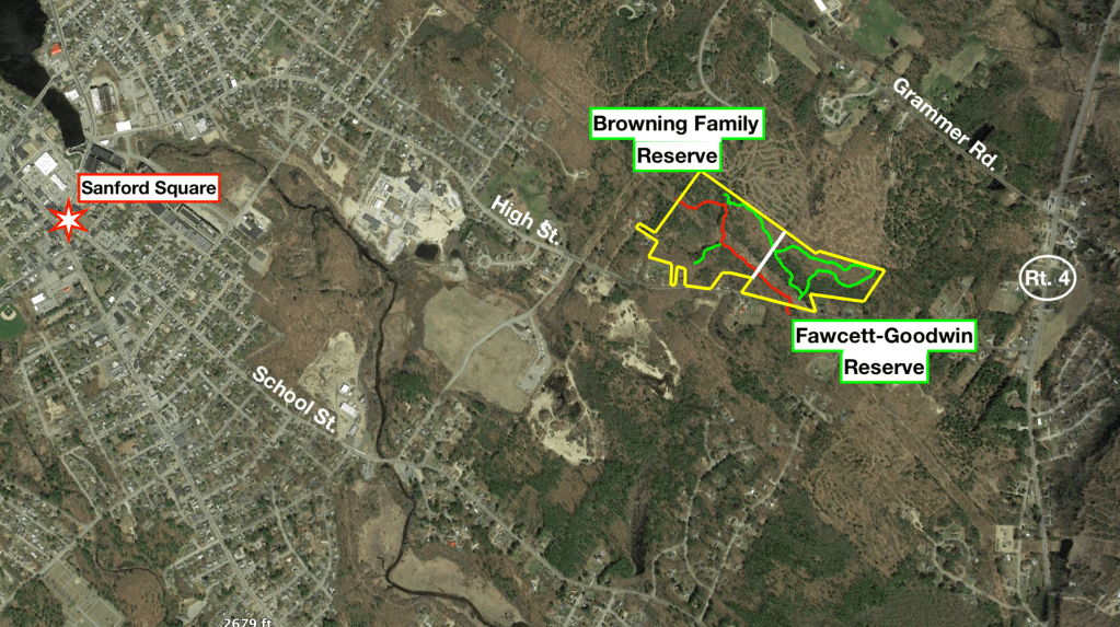 Gail Browning was honored on a recent Saturday morning for her generous donation of over 26 acres of land along High Street in Sanford. Mousam Way Land Trust gratefully accepted this wonderful property, which abuts the Trust’s Fawcett-Goodwin Reserve. There’s now a tract of over 45 acres of forest and meadow, with walking trails being sited and blazed—all just a stone’s throw from Sanford’s urban area.