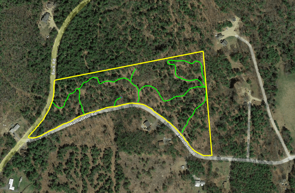 The middle of the lot is mostly elevated above either end so water moves into wetlands on both sides. Most of the land is covered with a shallow soil of fine sandy loam over a bedrock of mica schist. There are two major outcrops of schist along with some smaller ones along Back Road. Most of the stones in the walls are mica schist; some are sulfidic schist. There are very few granitic boulders. Water that collects in shallow depressions in the bedrock creates ephemeral wetlands that are scattered across the land; some are vernal pools of as yet undetermined significance. The lot drains to a culvert that passes under Walnut Hill Road. An enclosed, open topped spring is located halfway up the Walnut Hill Road boundary and was reserved for the use of the former Ross school house, now a residence at the intersection. Underground flow apparently also occurs at the western end of the Morrow property where it emerges in a wetland.